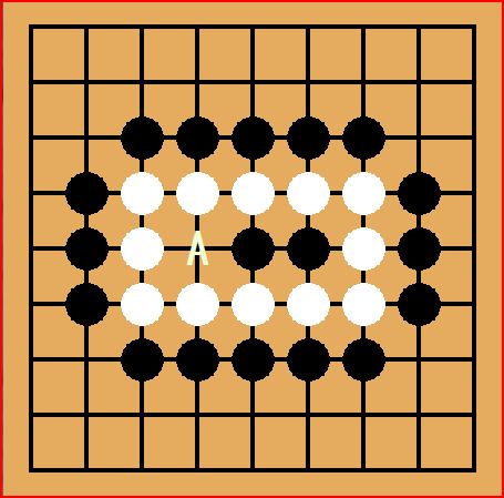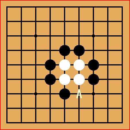 次が黒の番だとしたらAに打つと白を取り上げる事ができます。